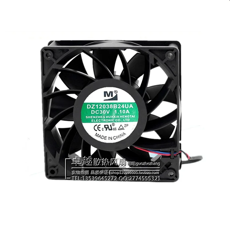 Model: DZ12038B24UA							 							 							 							Size: 120 × 120 × 38MM							 							 							 							Voltage: DC30V							 							 							 							Nominal current: 1.1A							 							 							 							Fan frame: injection molding, PBT + 30% glass fiber + VO grade flame retardant							 							 							 							Blade: injection molding, PBT + 30% glass fiber + VO grade flame retardant							 							 							 							Fan rotation: counterclockwise as viewed from fan blade							 							 							 							Operating temperature: -10 degrees Celsius to +70 degrees Celsius							 Storage temperature: -40 degrees Celsius to +70 degrees Celsius
